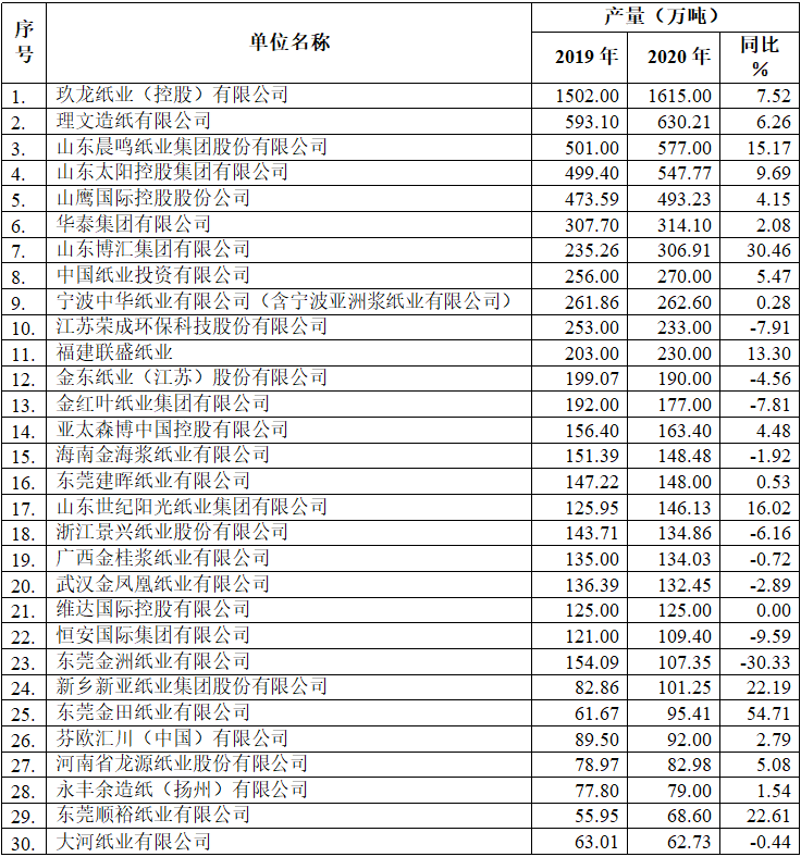 附表:2020年重點造紙企業(yè)產(chǎn)量前30名企業(yè)