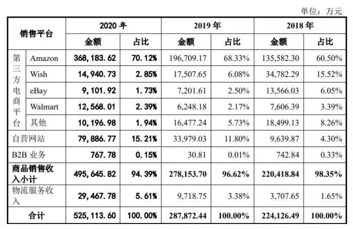 同在創業板沖刺IPO的賽維時代公司則主要依靠 Amazon、Wish、eBay、Walmart 等國際知名第三方電商平臺進行產品銷售。2018年至2020年報告期各期,其在亞馬遜平臺實現的銷售收入分別為 13.56億元、19.67億元和36.82億元,占其各期主營收入的比例分別為 60.50%、68.33%和70.12%。